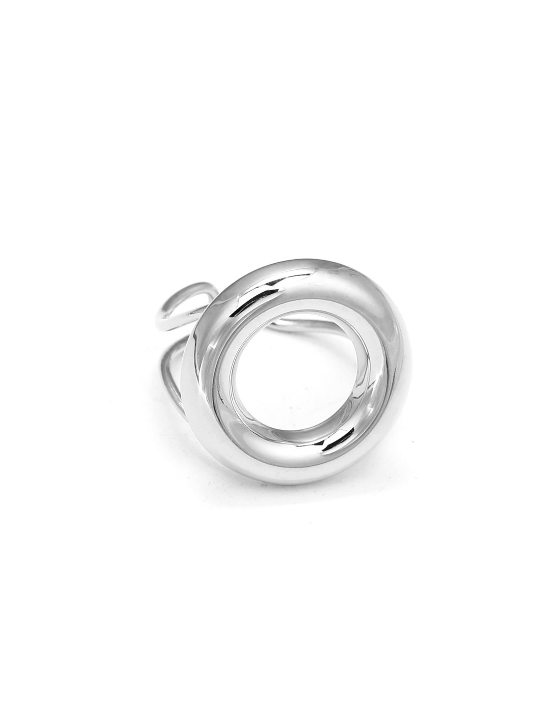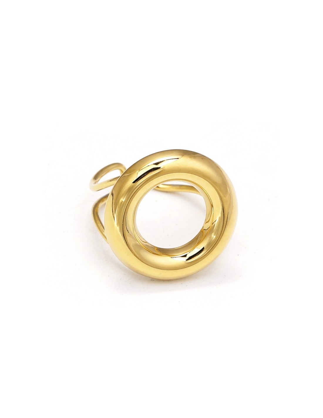 Anillo de diseño circular que crean un efecto tridimensional. La superficie es lisa y brillante, transmitiendo una sensación de elegancia contemporánea.