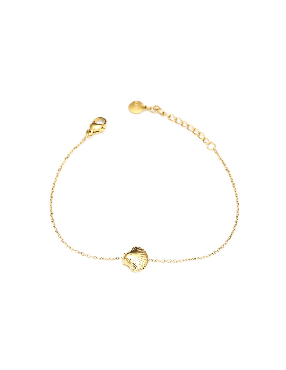 Pulsera delicada de cadena fina en color dorado, decorada con un pequeño colgante en forma de concha. El diseño es ligero, elegante y adecuado para uso diario.