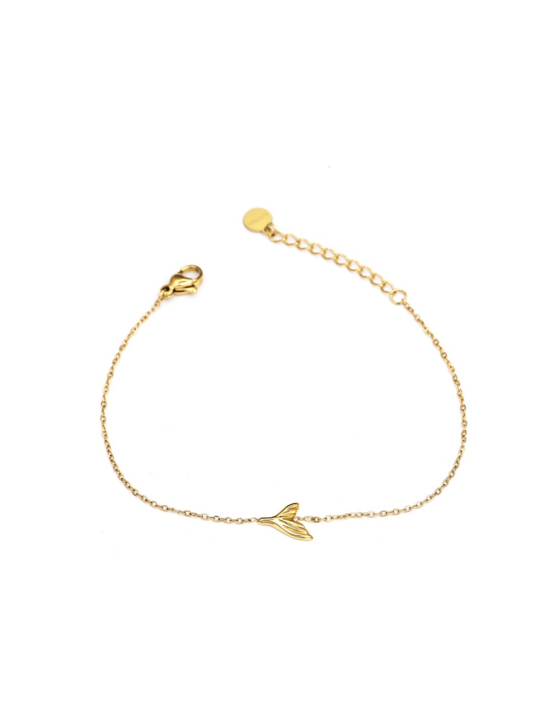 Pulsera delicada de cadena fina en color dorado, decorada con un pequeño colgante en forma de cola de pez. El diseño es ligero, elegante y adecuado para uso diario.