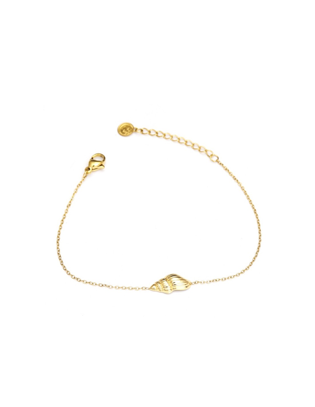 Pulsera delicada de cadena fina en color dorado, decorada con un pequeño colgante en forma de caracola. El diseño es ligero, elegante y adecuado para uso diario.