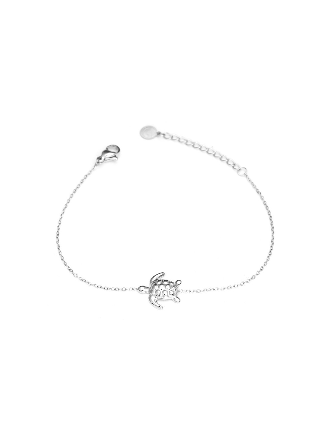 Pulsera delicada de cadena fina en color plateado, decorada con un pequeño colgante en forma de tortuga. El diseño es ligero, elegante y adecuado para uso diario.