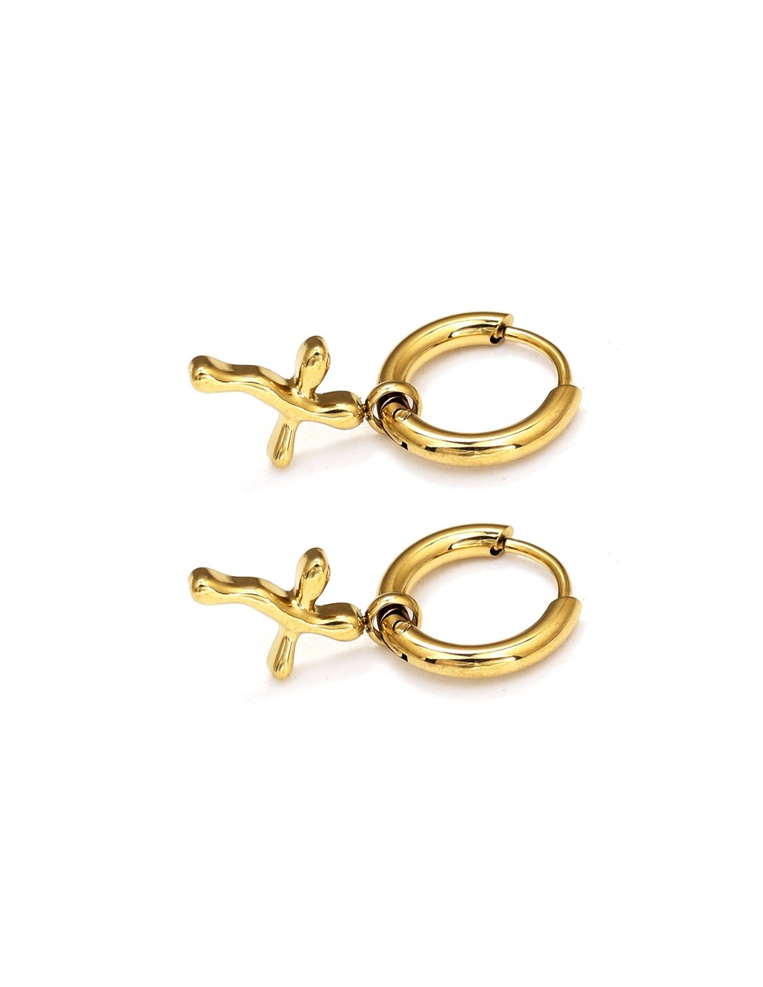Pendientes de aro dorados con colgantes de cruz. El estilo es contemporáneo y artístico, ideal para looks modernos.