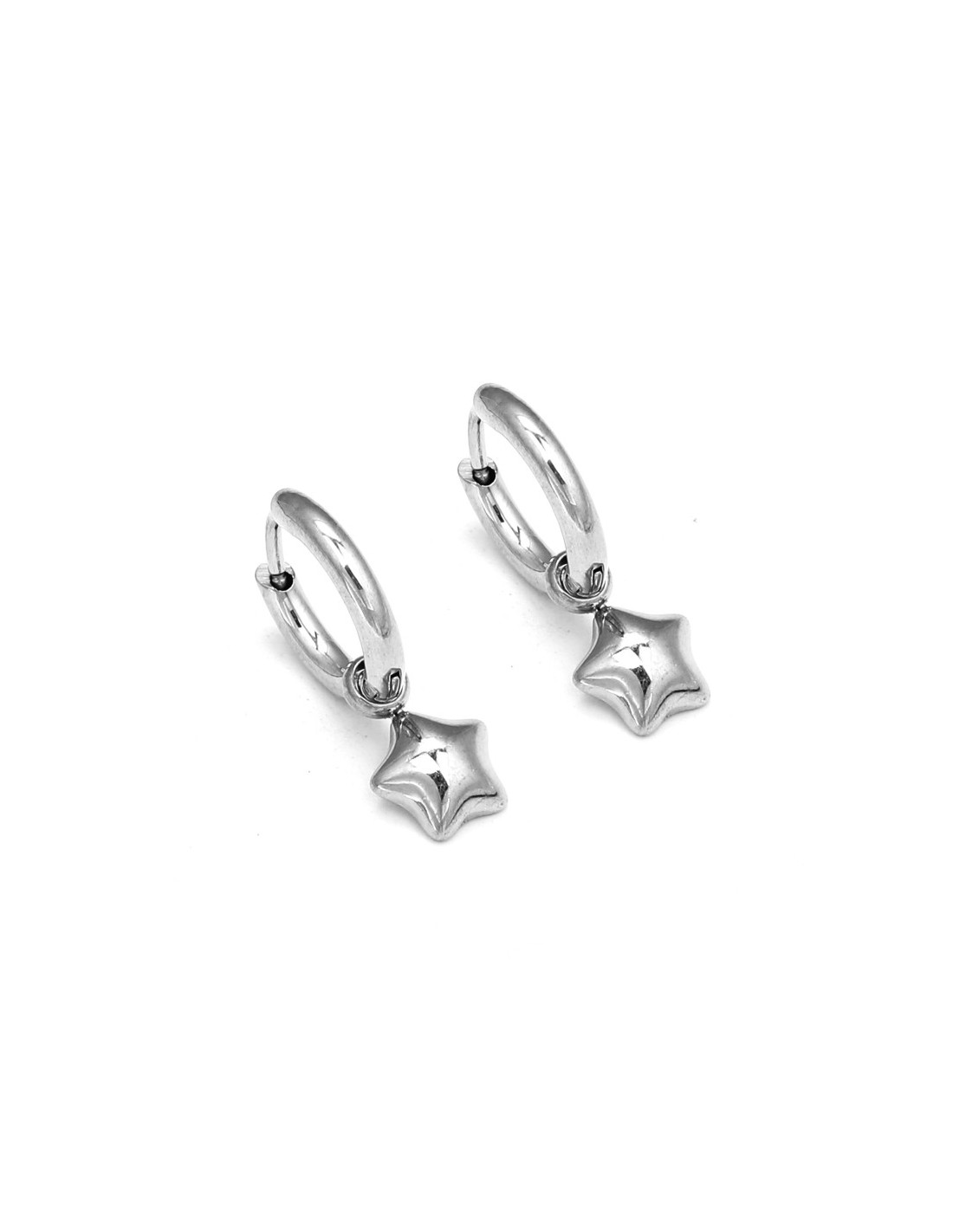 Pendientes de aro pequeños con colgantes de estrella. El estilo es contemporáneo y artístico, ideal para looks modernos.