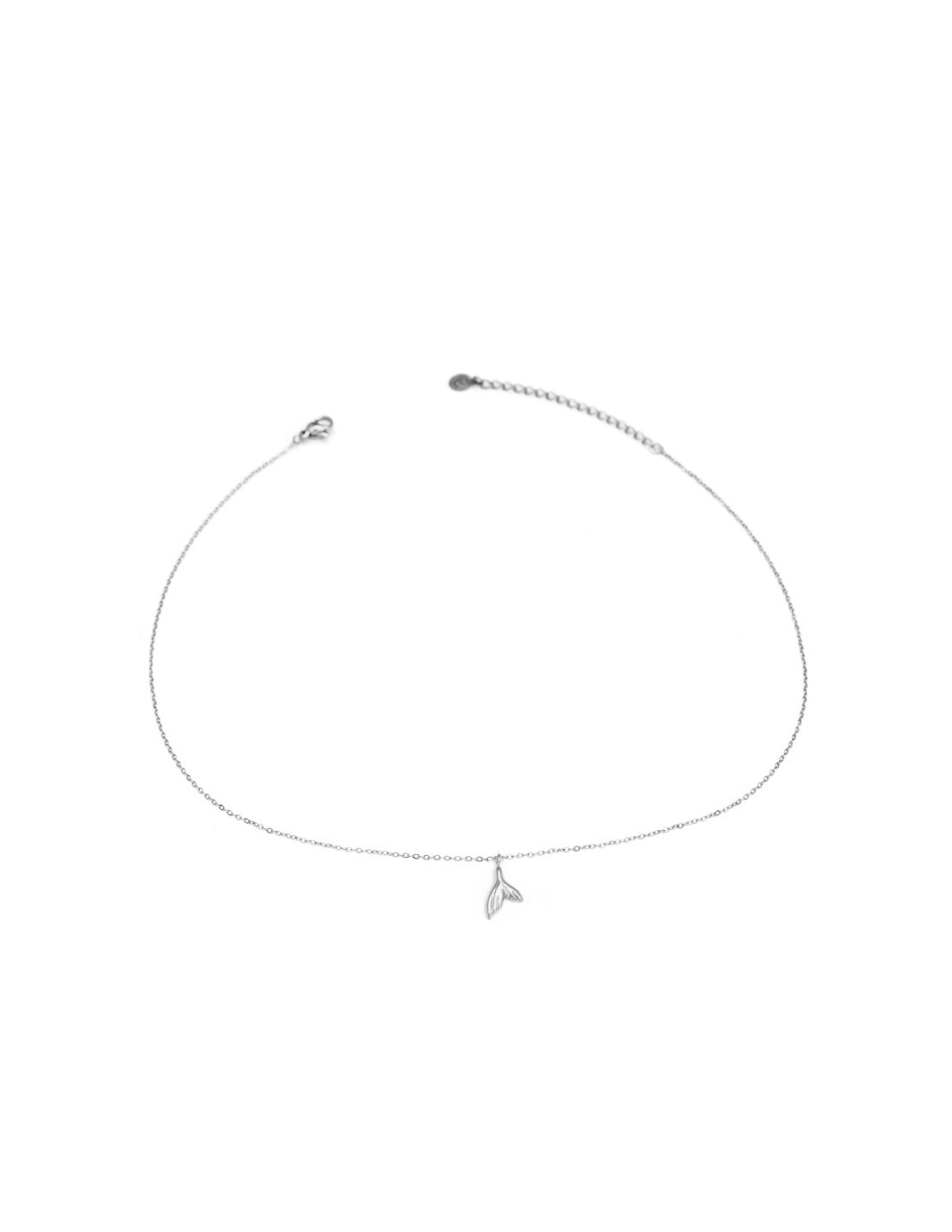Collar delicada de cadena fina en color plateado, decorada con un pequeño colgante en forma de cola de pez. El diseño es ligero, elegante y adecuado para uso diario.