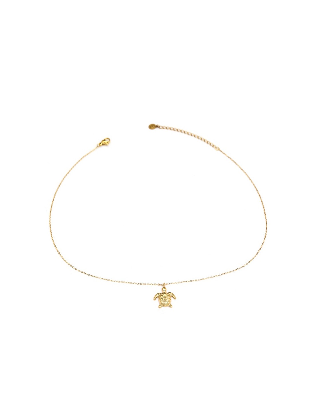 Collar delicada de cadena fina en color dorado, decorada con un pequeño colgante en forma de tortuga. El diseño es ligero, elegante y adecuado para uso diario.
