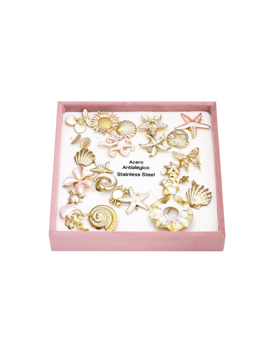 Bandeja decorativa para anillos con múltiples soportes individuales, diseñada con motivos marinos como conchas, estrellas de mar y caracoles. Presenta un acabado en tonos dorados. Algunos elementos en colores suaves.y detalles delicados.