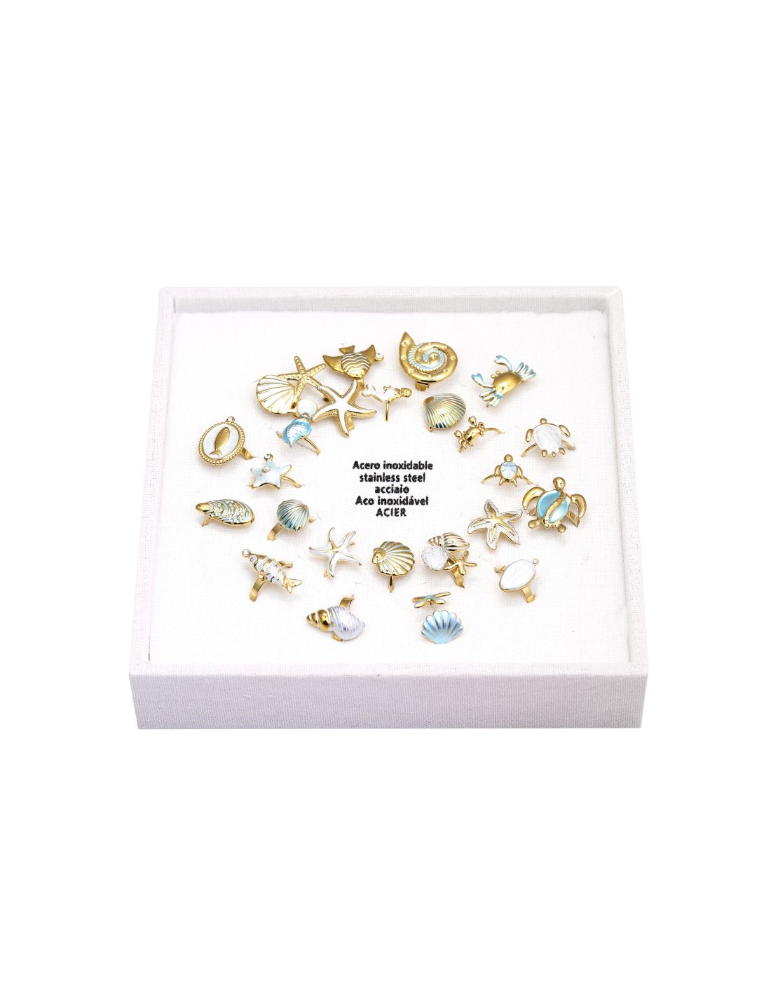 Bandeja decorativa para anillos con múltiples soportes individuales, diseñada con motivos marinos como conchas, estrellas de mar y caracoles. Presenta un acabado en tonos dorados. Algunos elementos en colores suaves.y detalles delicados.