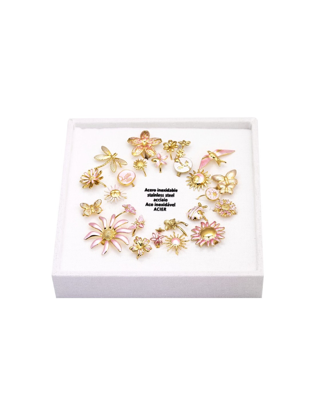 Bandeja para anillos decorada con motivos florales en tonos dorados, acompañados de esmalte en colores suaves. El estilo es femenino y romántico.