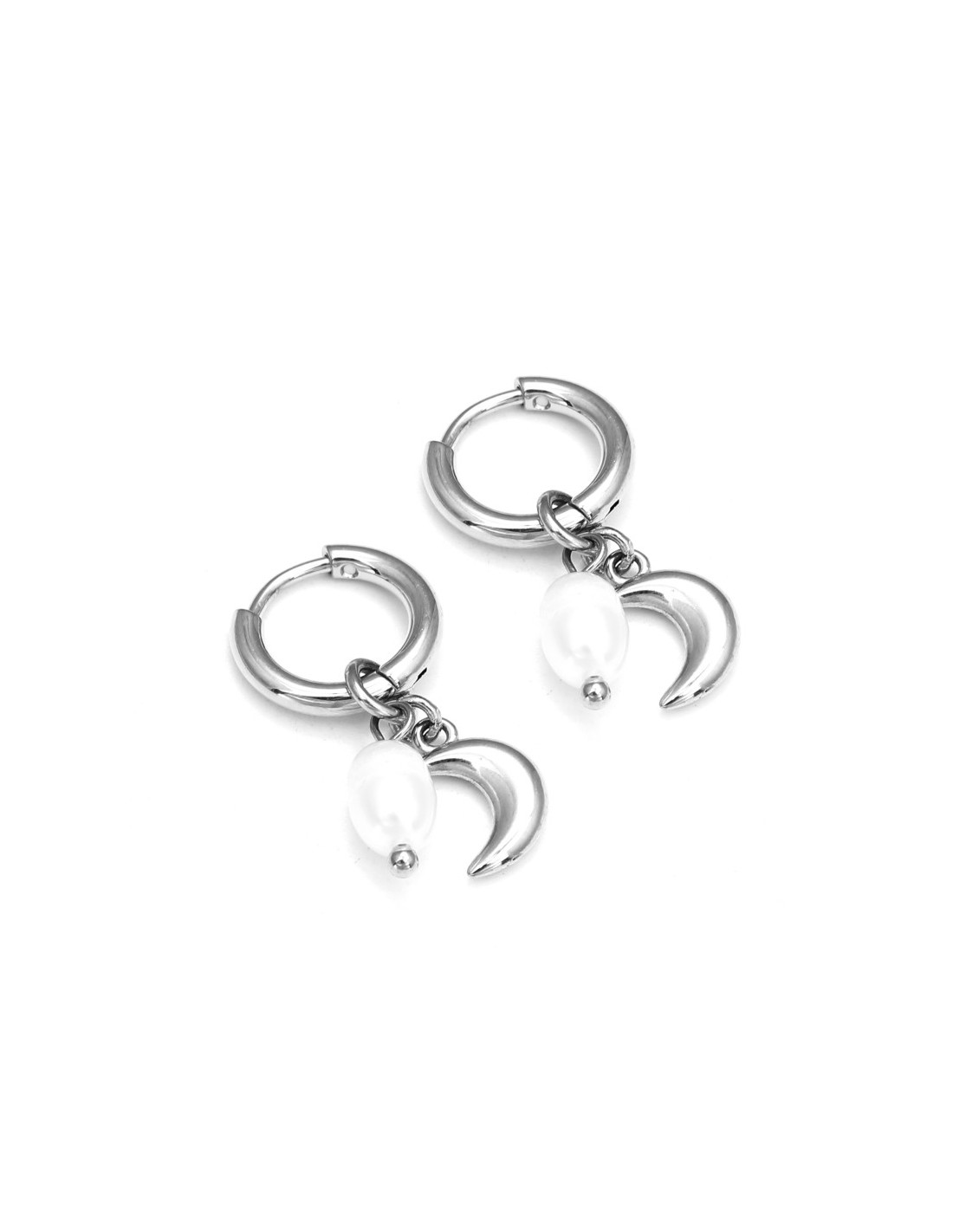 Pendientes con aro pequeño decorados con una perla y un colgante de luna, estilo delicado.