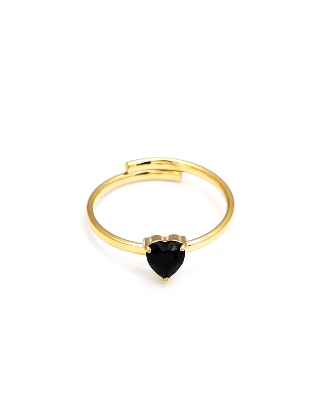 Anillo con piedra en forma de corazón, montada en un aro liso y brillante. Diseño elegante y femenino.