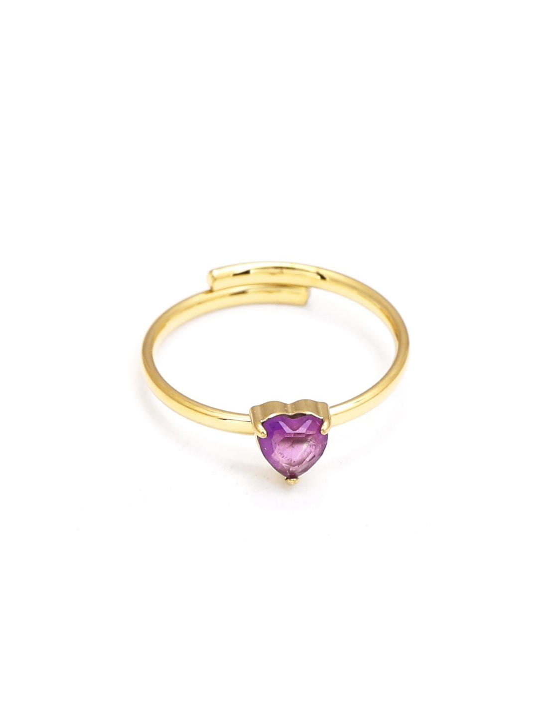 Anillo con piedra en forma de corazón, montada en un aro liso y brillante. Diseño elegante y femenino.