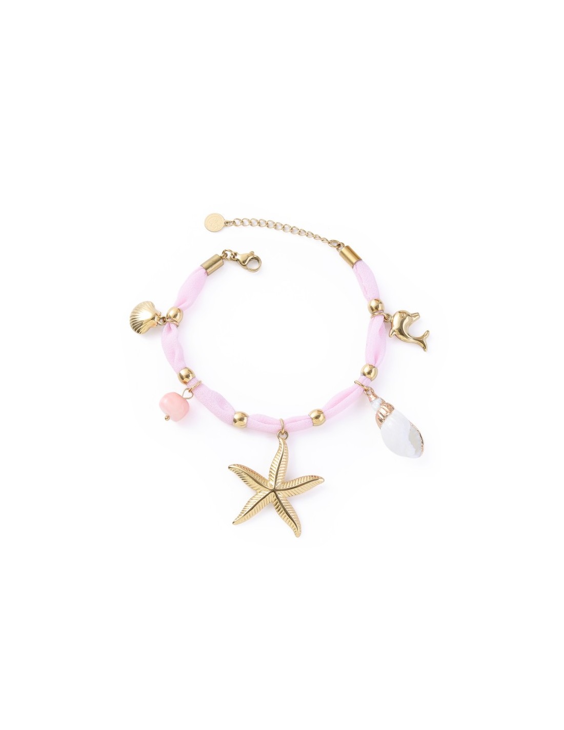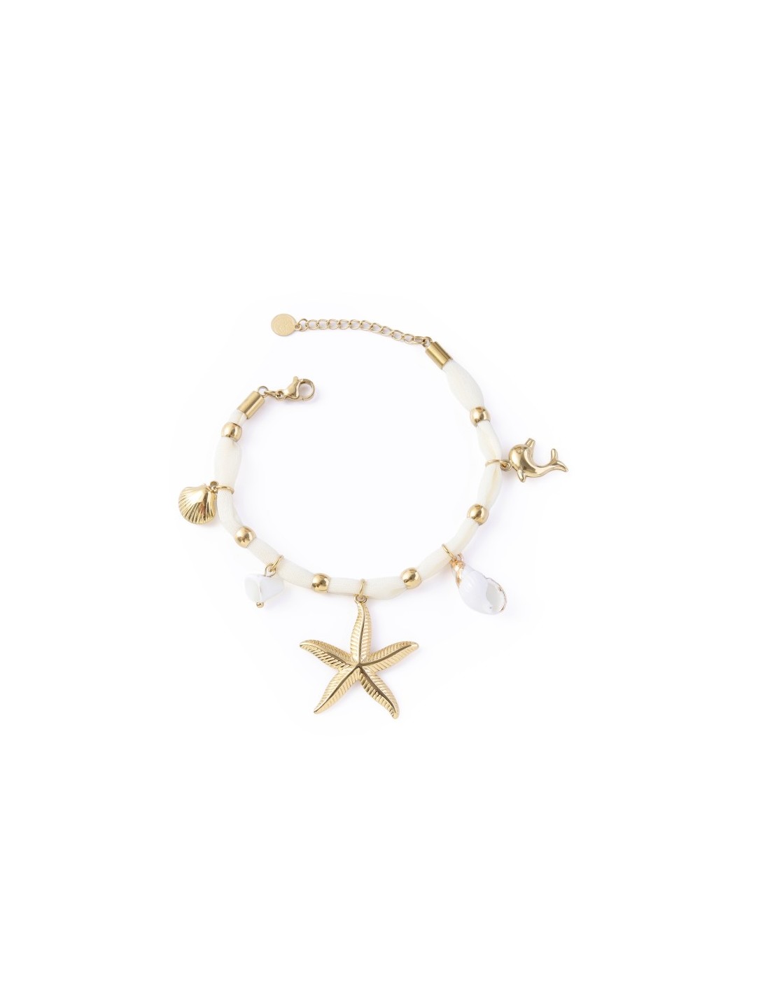 Pulsera con colgantes de estrella de mar, concha, delfín y cuentas de nácar, estilo marino delicado.