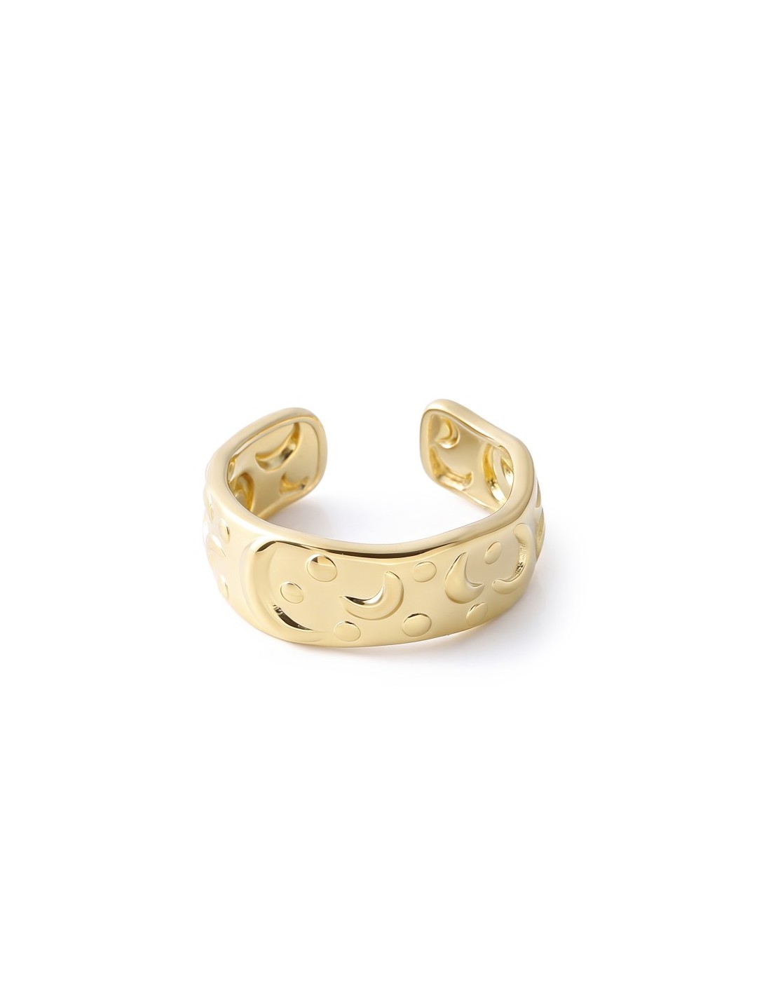 Anillo con decoración de lunas creciente acompañada de pequeños puntos circulares. El diseño crea un efecto celestial y equilibrado, con superficie pulida que aporta brillo y un estilo moderno y delicado.