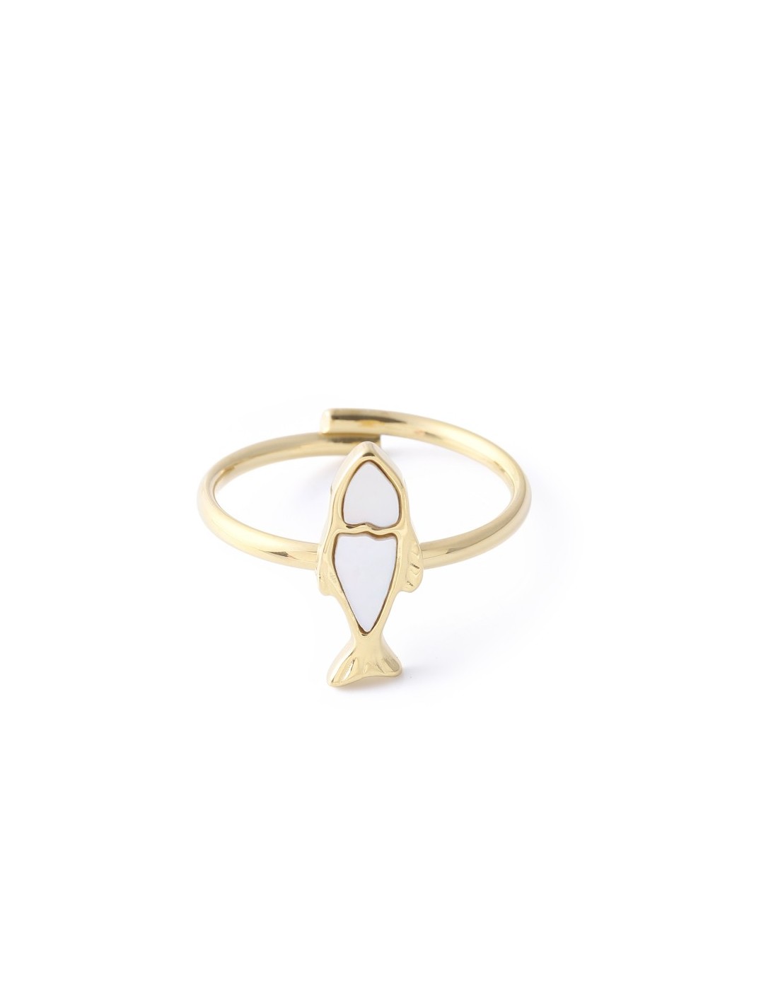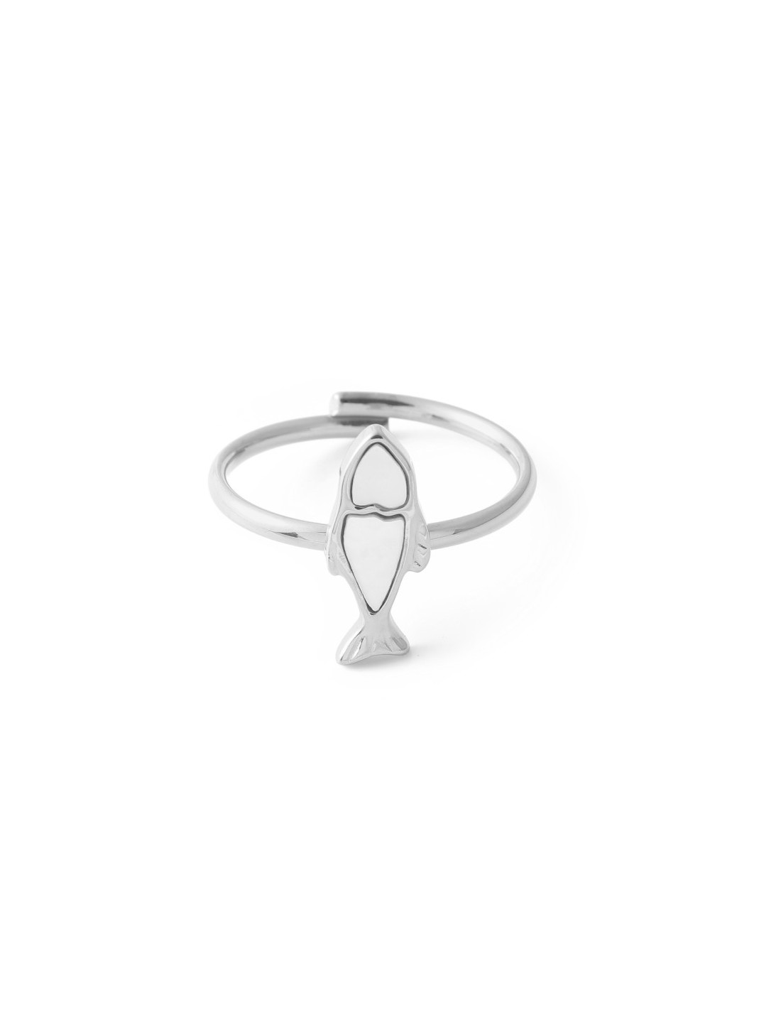 Anillo con forma de pescado en diseño sencillo, con centro de nácar que resalta por su brillo suave. Estilo limpio y moderno con acabado pulido.
