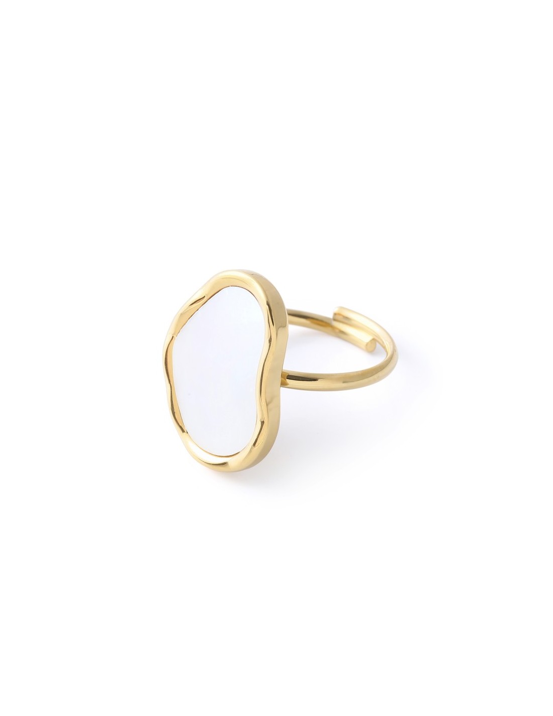 Anillo destaca por su diseño central en forma ovalado irregular, adornado con nácar natural que ofrece un brillo suave y elegante.