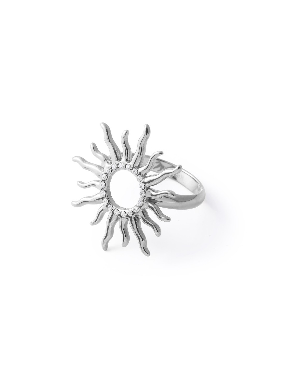 Anillo con diseño de sol en forma radial, con un círculo central abierto engastado con circonitas y rayos irregulares alrededor. Su diseño artístico lo hace una pieza original y decorativa.
