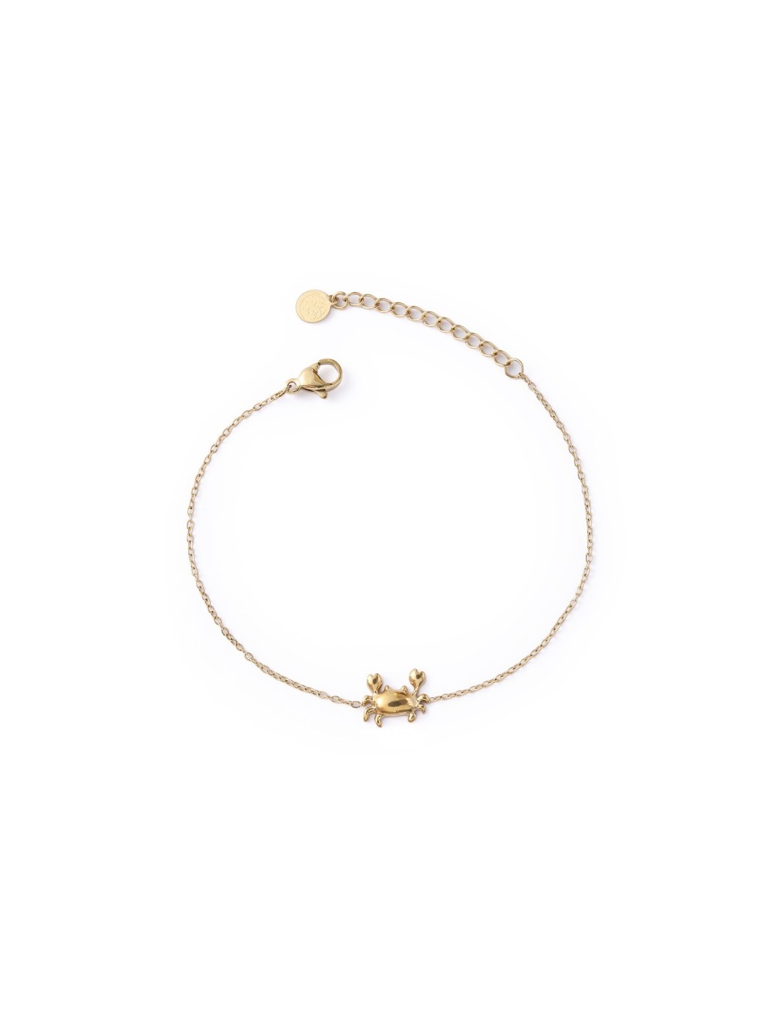Pulsera delicada de cadena fina en color dorado, decorada con un pequeño colgante en forma de cangrejo. El diseño es ligero, elegante y adecuado para uso diario.