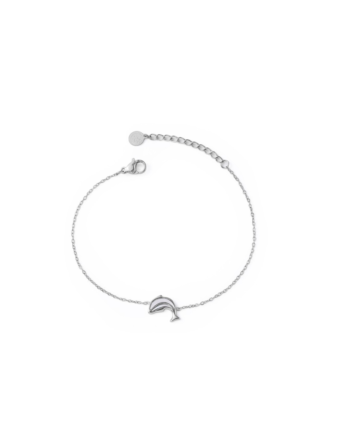 Pulsera delicada de cadena fina, decorada con un pequeño colgante en forma de delfín con nácar. El diseño es ligero, elegante y adecuado para uso diario.