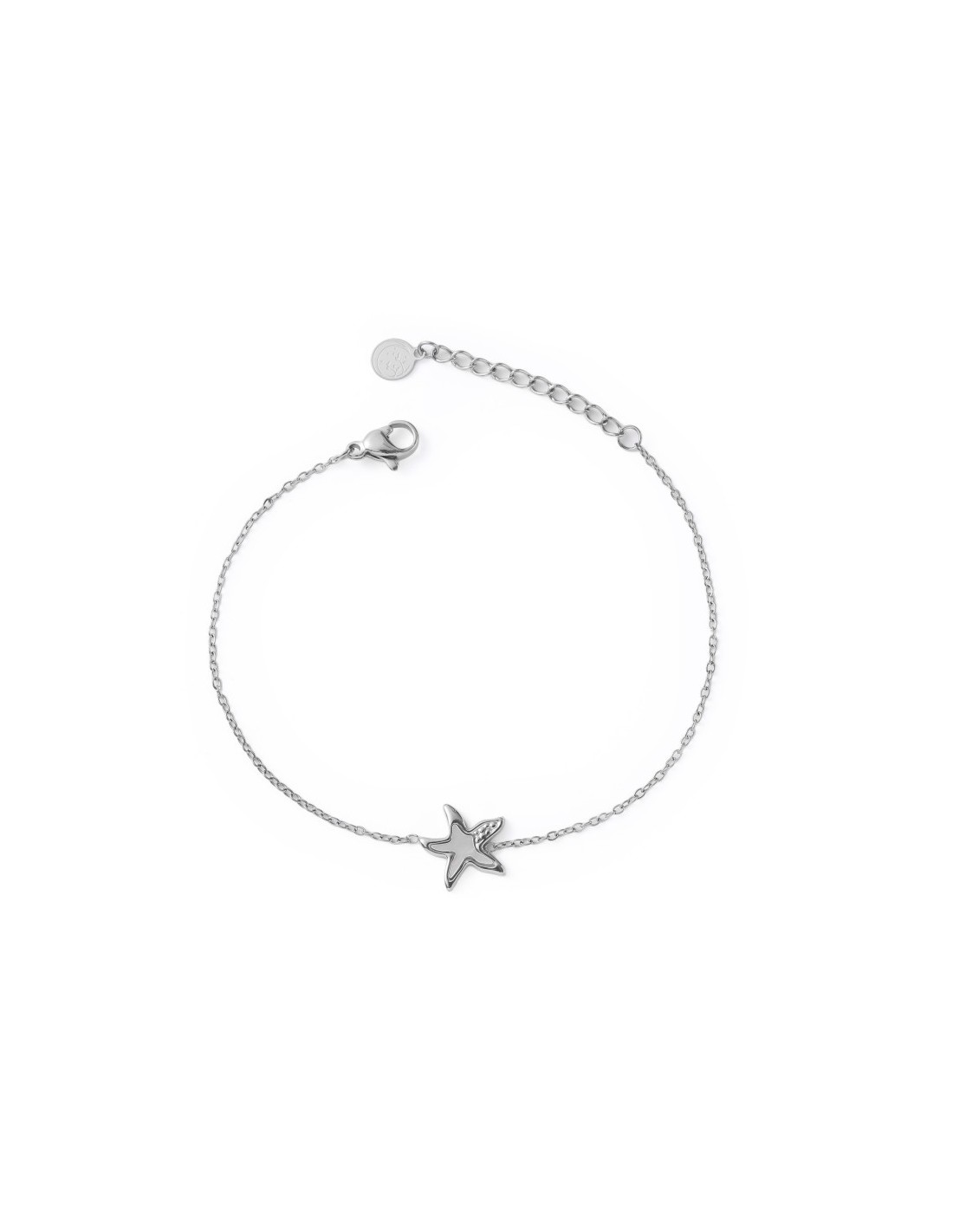 Pulsera delicada de cadena fina, decorada con un pequeño colgante en forma de estrella de mar con nácar. El diseño es ligero, elegante y adecuado para uso diario.
