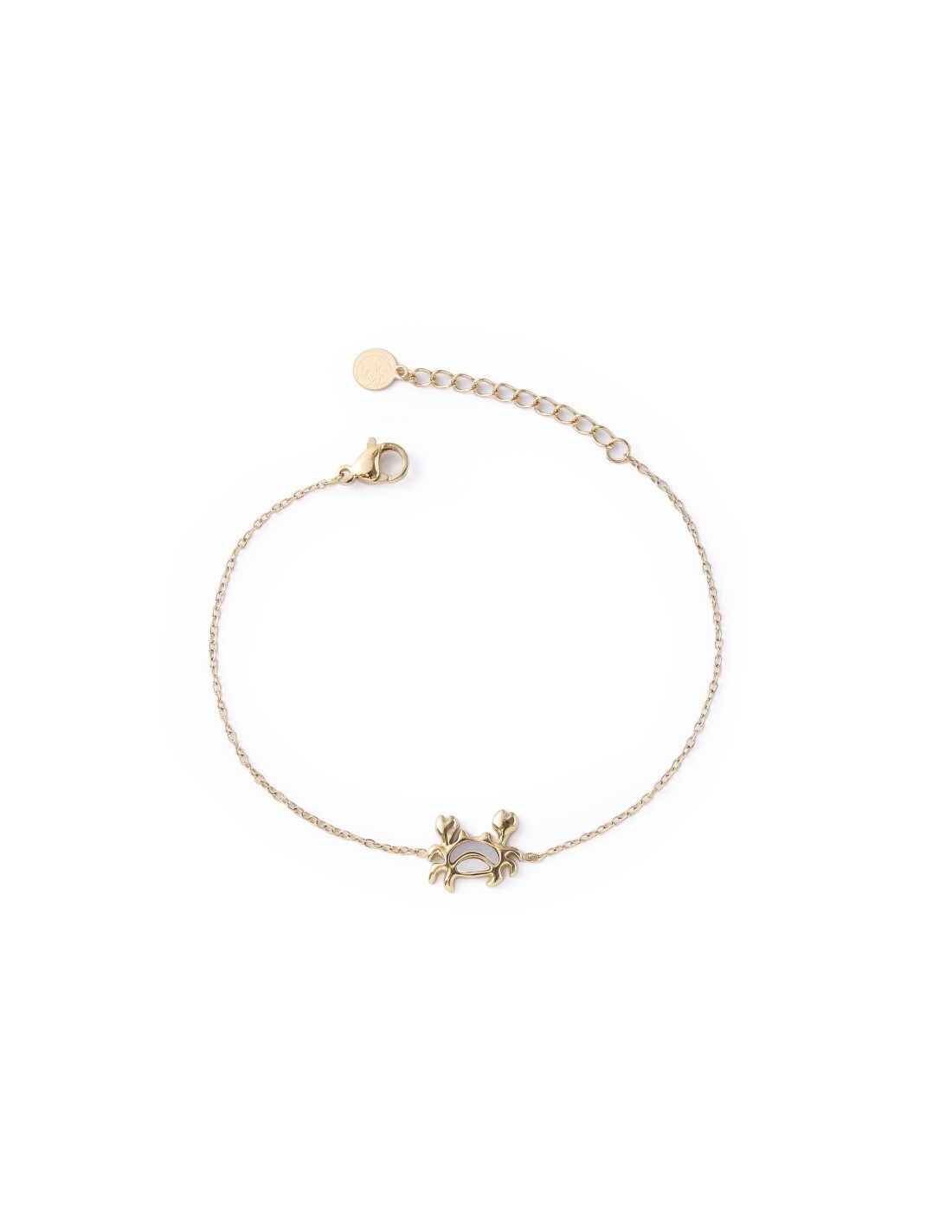 Pulsera delicada de cadena fina, decorada con un pequeño colgante en forma de cangrejo con nácar. El diseño es ligero, elegante y adecuado para uso diario.