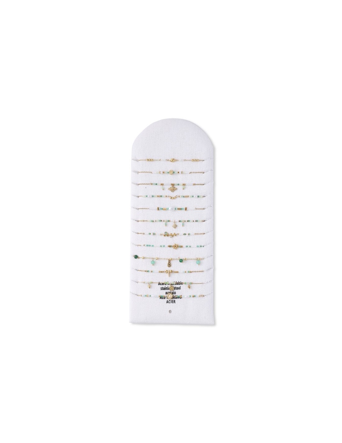 Conjunto de 12 pulseras elegantes con pequeñas cuentas, con un diseño minimalista y sofisticado. Está hecha de una cadena fina de color dorado, decoradas con varios estilos de delicados colgantes.