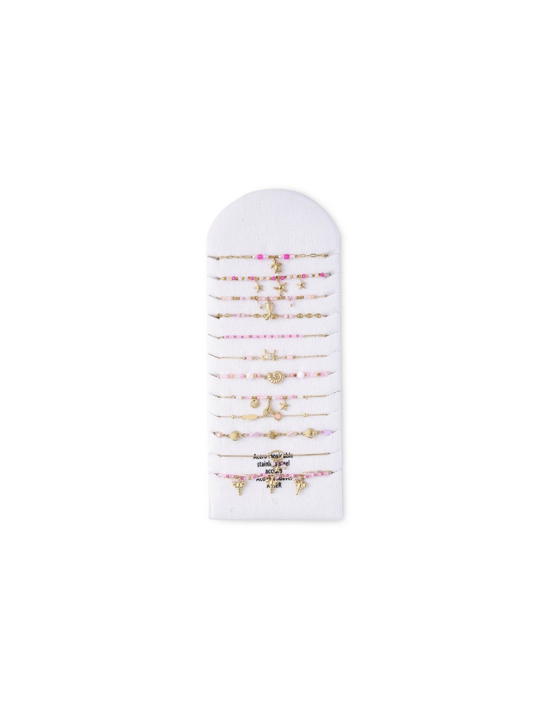 Conjunto de 12 pulseras elegantes con pequeñas cuentas, con un diseño minimalista y sofisticado. Está hecha de una cadena fina de color dorado, decoradas con varios  elementos oceánicos. Diseño armonioso y elegante.