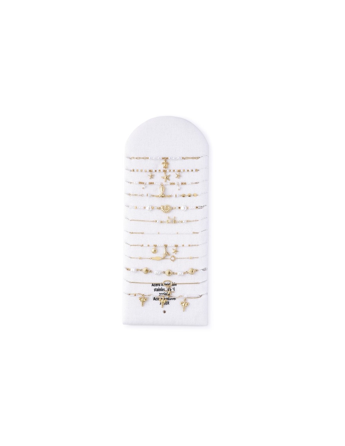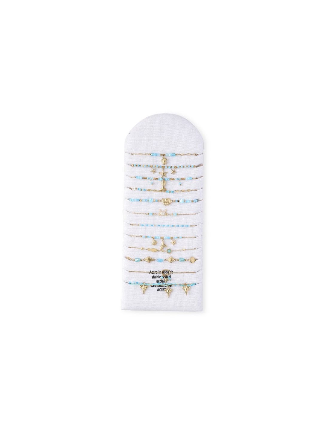 Conjunto de 12 pulseras elegantes con pequeñas cuentas, con un diseño minimalista y sofisticado. Está hecha de una cadena fina de color dorado, decoradas con varios  elementos oceánicos. Diseño armonioso y elegante.