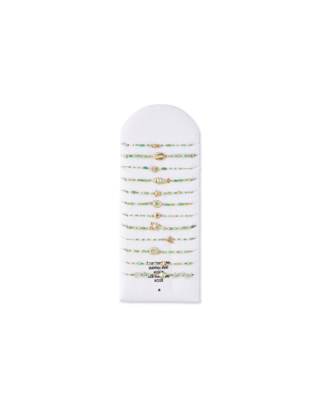 Conjunto de 12 pulseras elegantes con pequeñas cuentas, con un diseño minimalista y sofisticado. Está hecha de una cadena fina de color dorado, decoradas con varios  elementos oceánicos. Diseño armonioso y elegante.