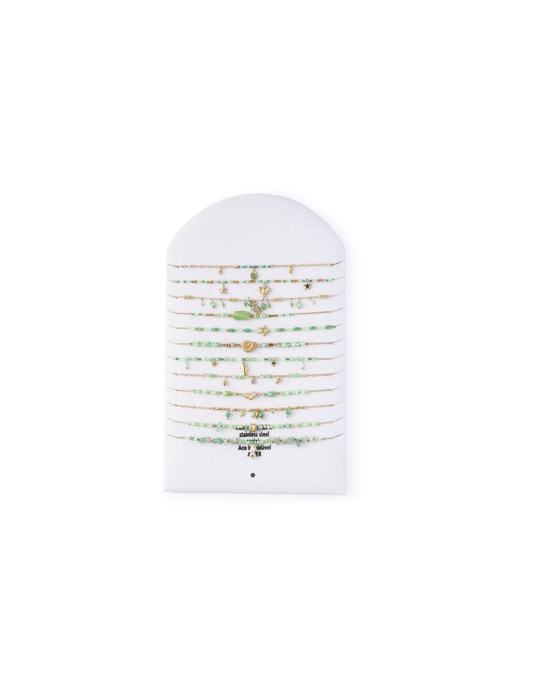 Conjunto de 12 collares elegantes con pequeñas cuentas, con un diseño minimalista y sofisticado. Está hecha de una cadena fina de color dorado, decoradas con varios  elementos oceánicos. Diseño armonioso y elegante.