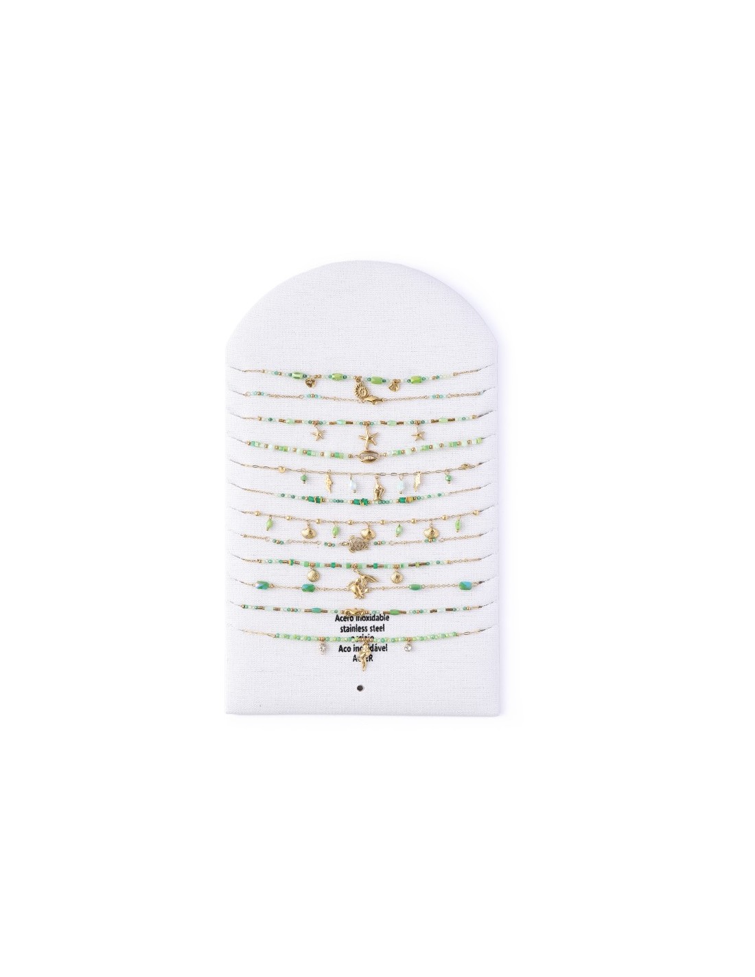 Conjunto de 12 collares elegantes con pequeñas cuentas, con un diseño minimalista y sofisticado. Está hecha de una cadena fina de color dorado, decoradas con varios  elementos oceánicos. Diseño armonioso y elegante.
