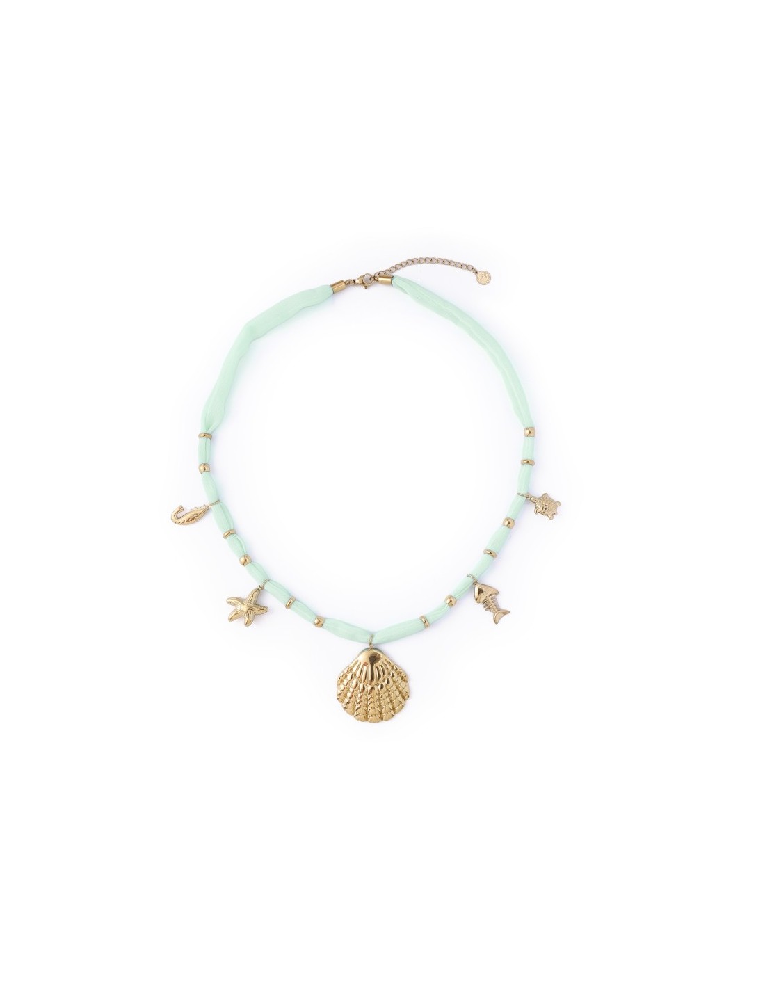 Collar con varios colgantes de símbolos oceánicos como estrella de mar, concha y espinas de pescado. Diseño llamativo y tropical.