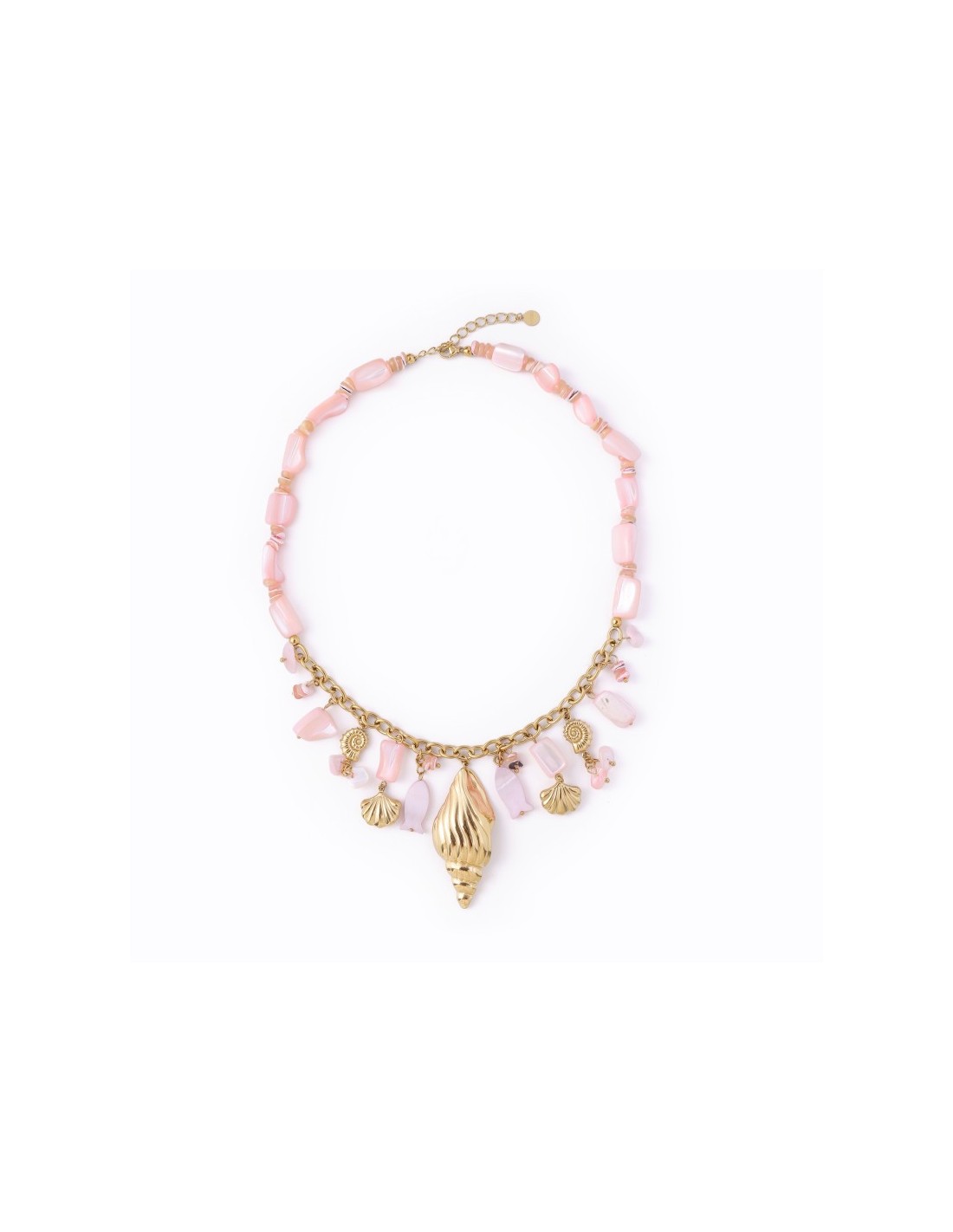 Collar elaborado con cuentas irregulares, con un motivo de caracola esmaltado en el centro, acompañado de pequeñas conchas y figuras marinas. El diseño evoca un look veraniego, juvenil y lleno de energía.