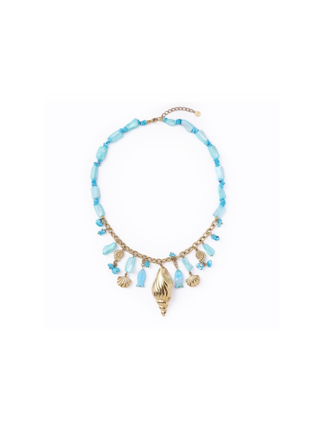 Collar elaborado con cuentas irregulares, con un motivo de caracola esmaltado en el centro, acompañado de pequeñas conchas y figuras marinas. El diseño evoca un look veraniego, juvenil y lleno de energía.